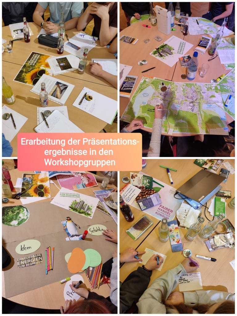 Am Ende trafen sich alle Workshopgruppen wieder und stellten ihre Ergebnisse vor. Die anfängliche Scheu der Schülerinnen und Schüler war zum Großteil verschwunden und so zeigten sie den anderen, was sie in den zwei Stunden mit ihren Teamleitern erarbeitet hatten. Zum Teil ging es bei einigen Gruppen etwas theoretischer zu, wie beispielsweise bei den erneuerbaren Energien, die im Einzelnen dann erklärt wurden. Aber es wurde auch gelacht, vor allem als die Gruppe rund um Revierförster Oliver Hering aufzählte und eben zeigte, was sie so alles an Müll in der Umgebung der Möncherei gefunden hatten: die gefundene Autobatterie sorgte noch für Kopfschütteln, der aufgesammelte Dildo dann doch für Gekicher.