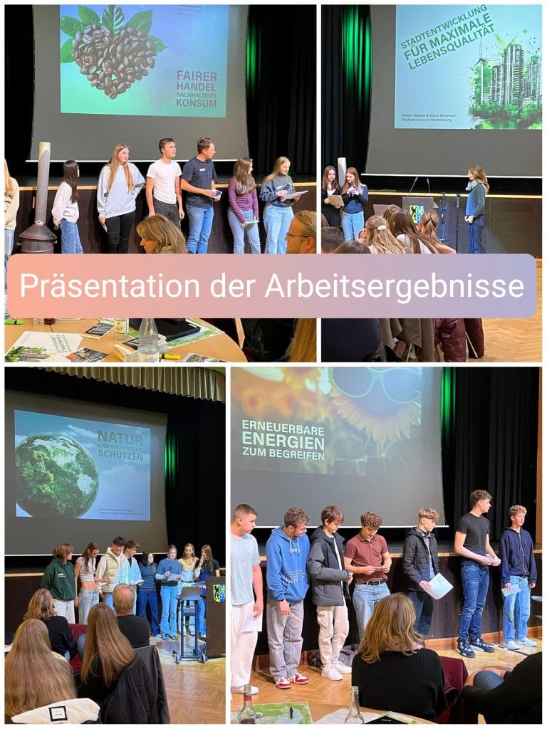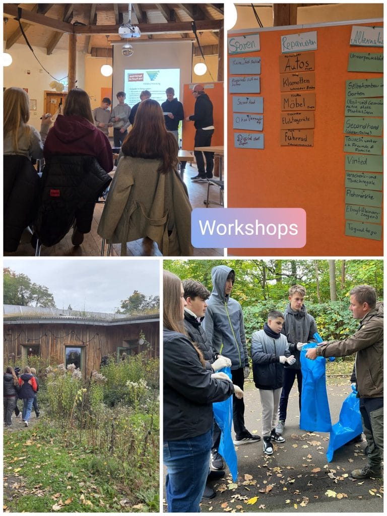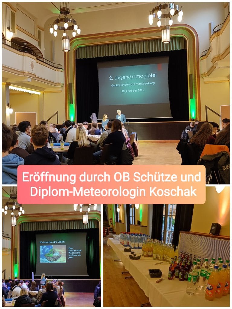 Unsere vier Klassen der Jahrgangsstufe 9 waren von der Stadt Markkleeberg zum 2.Klimagipfel im Lindensaal eingeladen. Nachdem die Schülerinnen und Schüler von OBM Schütze begrüßt wurden, stimmte die Diplom-Meteorologin Michaela Koschak, bekannt auch vom MDR, die Jugendlichen auf die bevorstehenden Workshops ein. Hier sprach sie bereits die Problematiken unserer aktuellen Klimasituation an und versuchte, die Schülerschaft einzubinden, die sich hier noch etwas zaghaft zeigte. Das blieb aber nicht so, denn in acht verschiedenen Workshops bearbeiteten die Neuntklässler diverse Thematiken, die vielleicht gar nicht auf den ersten Blick etwas mit unserem Klima zu tun haben. So befassten sich beispielsweise zwei Workshops mit den Themen Konsum und Kaufverhalten, eine andere Gruppe thematisierte die erneuerbaren Energien. Weitere Themen waren u.a. die Mobilität der Zukunft, Müllvermeidung, Stadtentwicklung, Natur und Ökosystem und auch die Land- und Forstwirtschaft. Dazu ging es für einige Workshops auch raus aus dem Lindensaal.